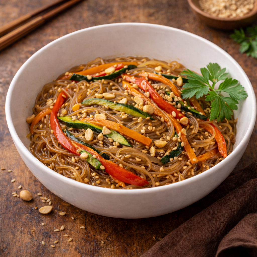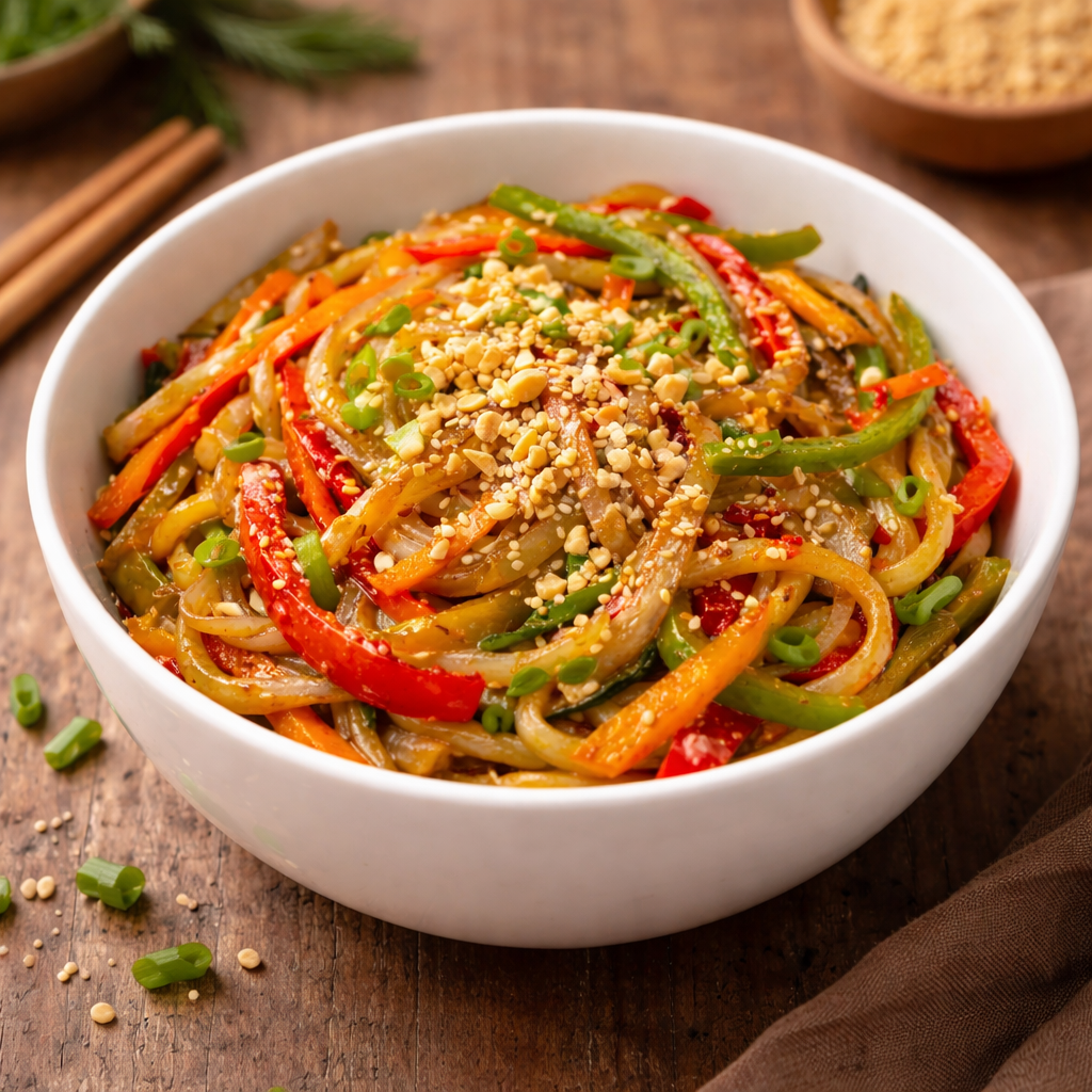 Фунчоза, перець, морква, цукіні, цибуля, арахіс, соус Тонкацу, соус солодкий Чилі, соєвий соус, імбир маринований..