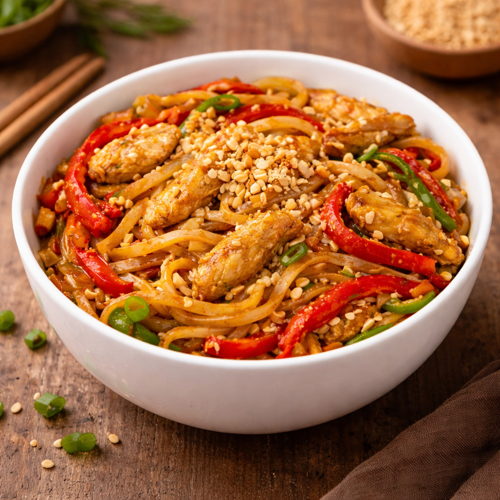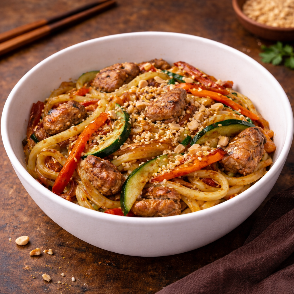 Локшина удон, філе курча, перець, морква, цукіні, цибуля, часник, арахіс, соєвий соус..
