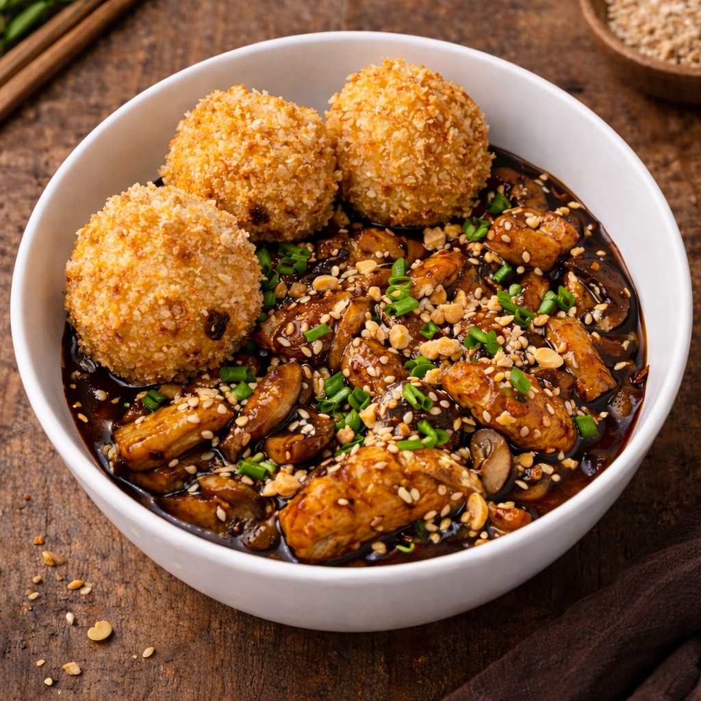 Рис, філе курча, шампіньйони, цибуля зелена, сухарі панко, кунжут, арахіс, соус Теріяки..