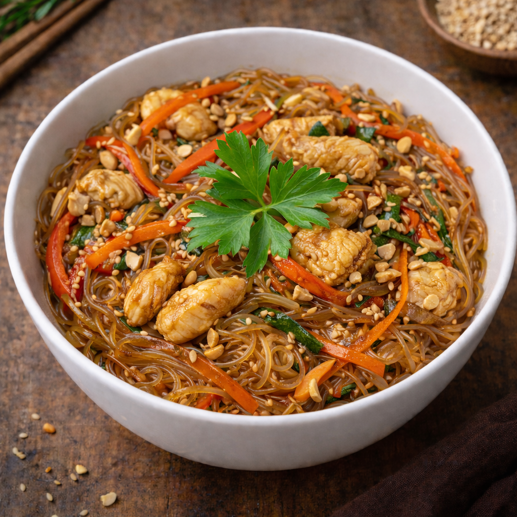 Фунчоза, філе курча, перець, морква, цукіні, цибуля, часник, арахіс, соус Тонкацу, соус солодкий Чилі, соєвий соус, імбир маринований..